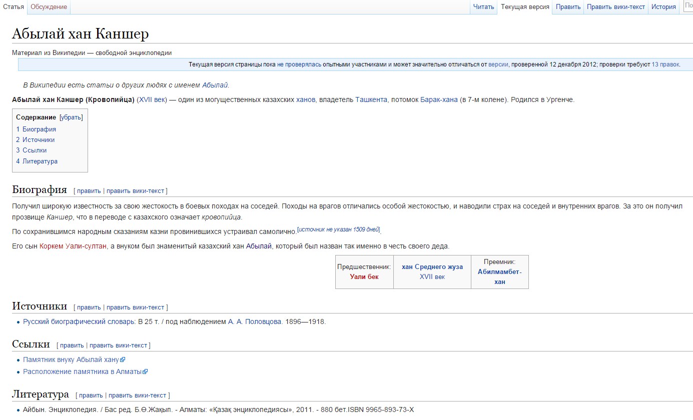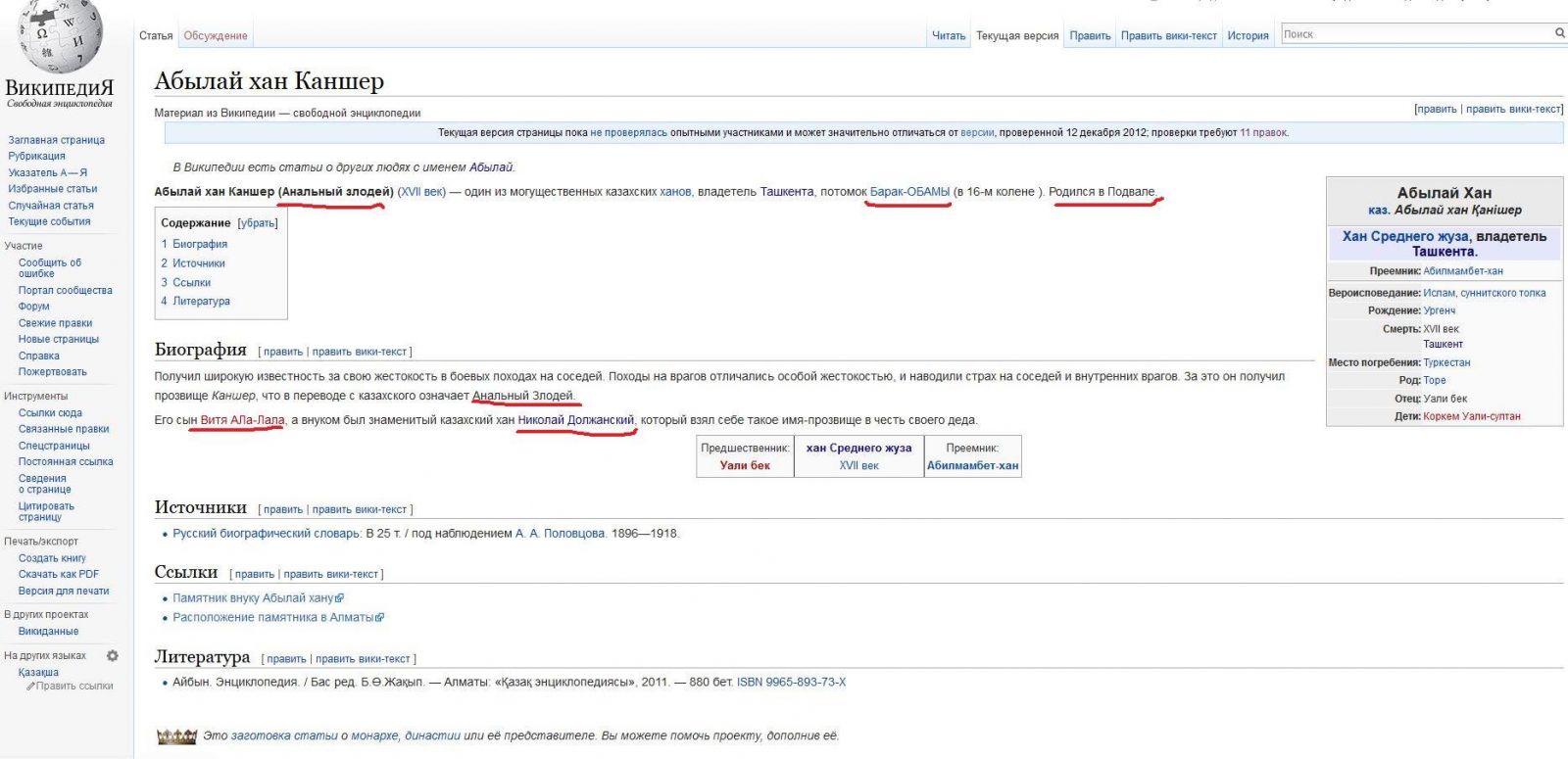 Энциклопедияданың орысша бетіндегі «Абылай хан Каншер» деген тақырыппен жазылған анықтамаға шындыққа жанаспайтын мәліметтер енгізілген. Атап айтқанда, қазақ ханын «Анальді зұлым», «Барак Обаманың он алтыншы бабасы» деп атап, қазақ халқы мен оның ханына қатысты басқа да жалған ақпараттар орналастырылған.