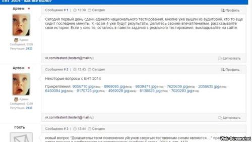 Қазақстанда мектеп бітірушілер 2-9 маусым арасында тапсыратын ұлттық бірыңғай тестінің (ҰБТ) бірінші күні-ақ елдегі жастар көп қолданатын «ВКонтакте» және «Мой мир» әлеуметтік желісінде биылғы емтихан сұрақтары жарияланып жатыр. Тапсырмалардың көбі ұялы телефонға суретке түсірілген. Сынақ тапсыру ережесі бойынша талапкерлерге аудитория ішінде ұялы телефон алып кіруге тыйым салынса да, тыйымды айналып өтудің амалын тапқандар аз емес сияқты.