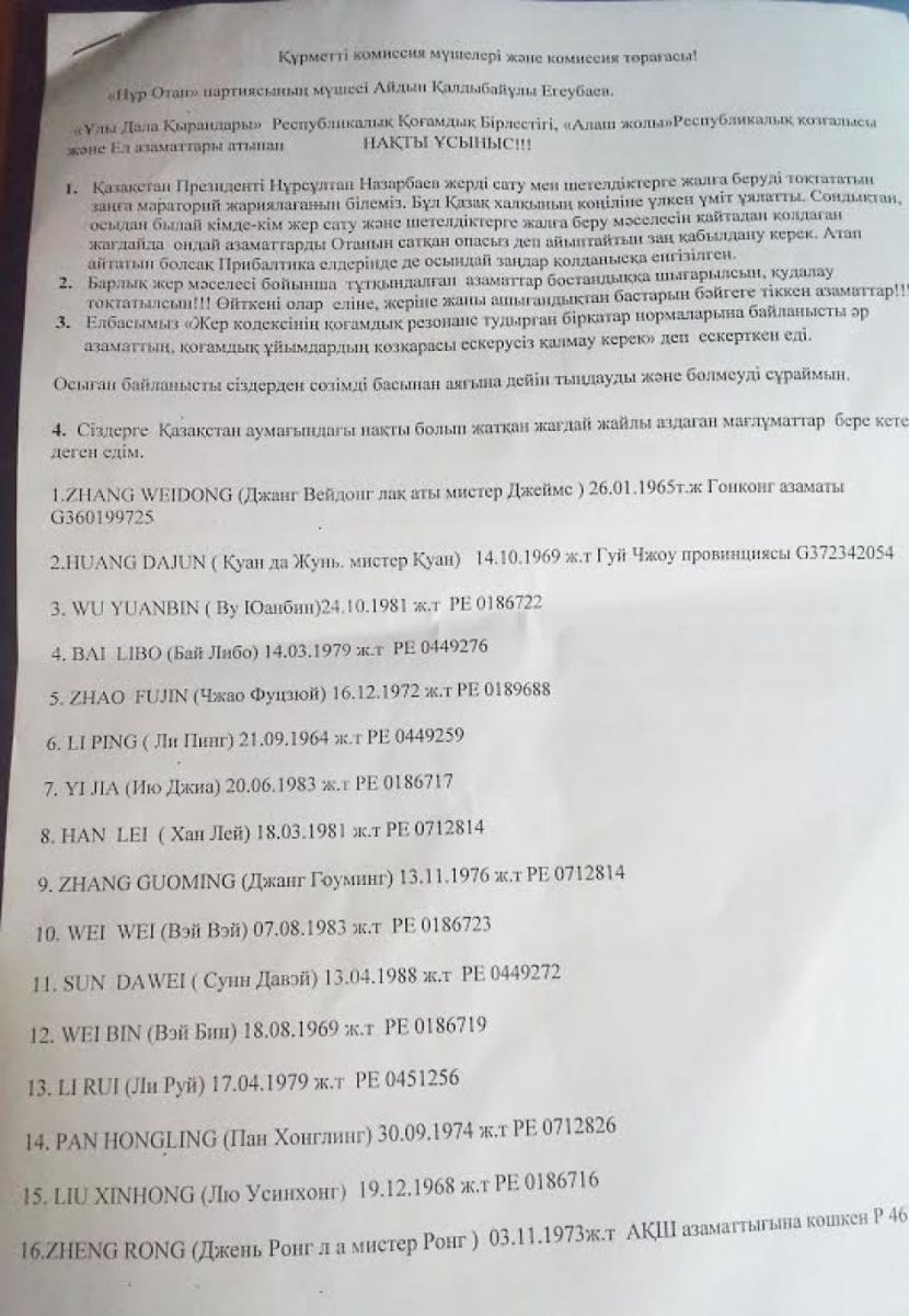 А. Егеубаев Шығыс Қазақстан облысы Үржар ауданында қытайлықтардың 45 пайыздық үлесі бар біріккен компания қызмет бастағанын, оның 8 мың га жерге соя егіп жатқанын, біріккен кәсіпорынға Қазақстан тарапынан 6 млрд теңге, 20 млн доллар шетелдік инвестиция тартылғанын жайып салды. Оның айтуынша, компанияның 45 пайыз үлесі қытайлық Джан Вейдонг (Zhang Weidong) деген азаматқа тиесілі көрінеді. Мұндай қитұрқылыққа еліміздің заңнамасы тосқауыл қоймайды, шетелдіктер үлесі 49 пайыздан аспайтын компанияларға уылшаруашылық жерлері жалға беріледі.