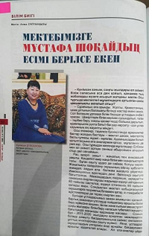 Осы орайда Шоқайтанушы ғалым ретінде бізбен танысқысы келетінін, оның сәтінін бүгін түскенін айтып қуанышын білдірді. Оның бүкіл арманы 1917 жылдан көз жұмған 1941 жылға дейін Қазақстан тәуелсіздігі үшін қажымай күрес жүргізен және осы ұлы мақсат жолында жанын құрбан қылған Мұстафа Шоқайдың атын өзі басқарып отырған мектепке беру. Бірақ бұл туралы тиісті орындарға берген өтініш құжаттары он жылдан бері қабылданбай келеді екен.