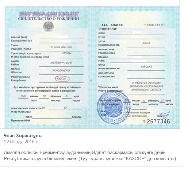 «Ақмола облысы Ерейментау ауданының Әділет басқармасы әлі күнге дейін Республика атауын білмейді екен. Туу туралы куәлікке "КАЗССР" деп қойыпты, - дейді ол.