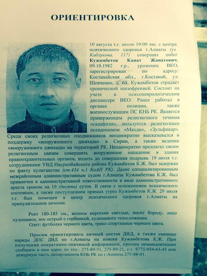 Сөйтсек, 1982 жылы туған Қанат Қожамбетов есімді науқас тегін науқас емес екен. Ол жай ғана көп салафиттің бірі емес, 2014 жылы Өскеменде жастарды теріс діни ағымға тартып, жиһадқа шақырғаны үшін істі болған, сот қаулысымен 100 АЕК көлемінде айыппұл төлеп құтылған, солайша құқыққорға уоргандарының қырағы назарына іліккен жан көрінеді. Бұл айтылғандардың біразы полиция таратқан «ориентировкада» да көрініс тапқан.
