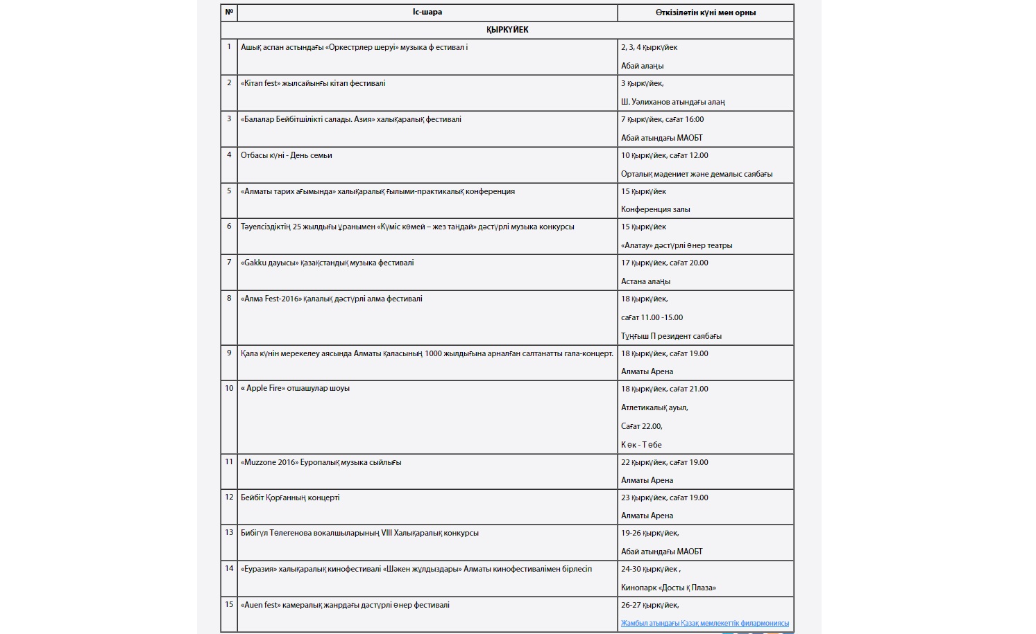 Мысалы, қалада 2, 3, 4 қыркүйек күндері Абай алаңында сағат 19.00 –де жыл сайынғы ашық аспан астындағы «Оркестрлер шеруі» VII фестивалі ашылады. Фестивалдің алғашқы күні Арман Жүдебаевтің басқаруымен және «Сазген сазы» фольклорлық –этнографилық ансамбльдің қатысуымен Қазақ академиялық халық аспаптары оркестрі өнер көрсетеді. Екінші күні қала тұрығндары мен қонақтары үшін 80 жылдардың хиттері шырқалады. Композициялар Қанат Ахметовтың басшылығымен үрлемелі оркестердің орындауда жүзеге асады. Соңғы күнгі концертті Мемлекеттік академиялық оркестр қорытындылайды.