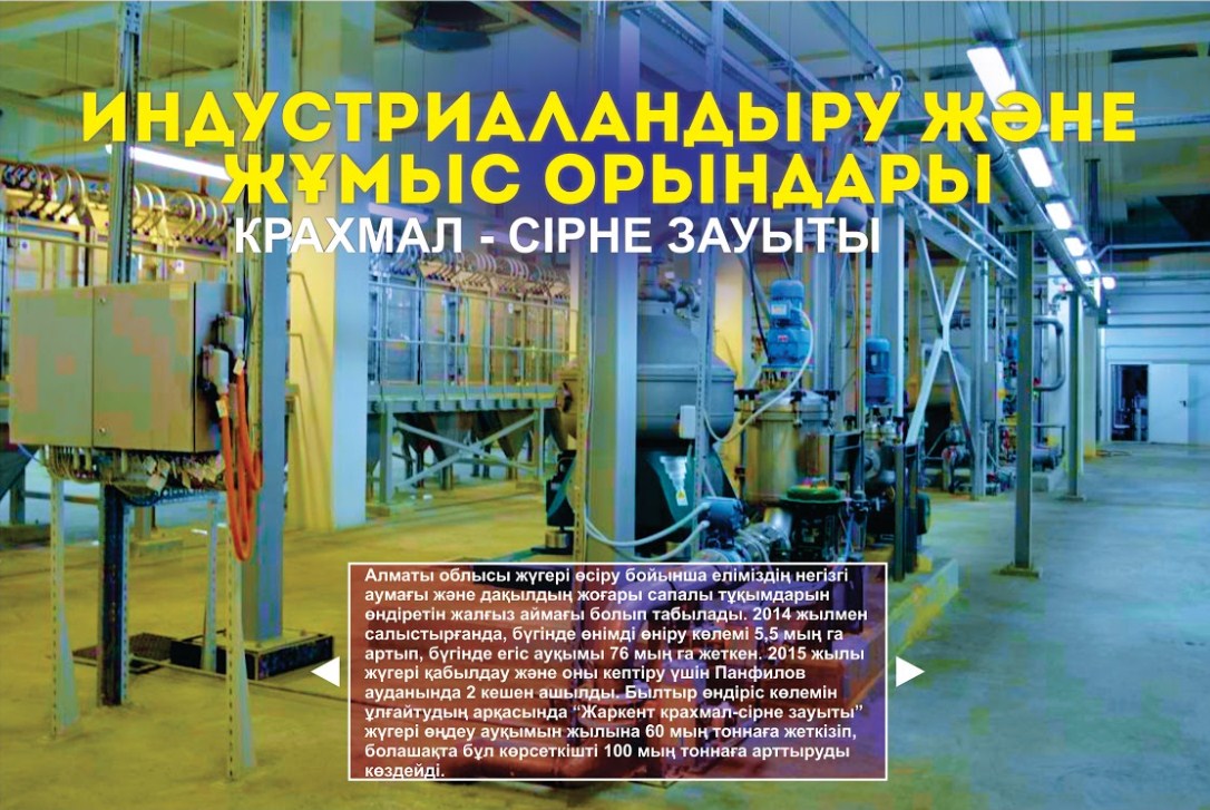 Алматы облысы жүгері өсіру бойынша еліміздің негізгі аумағы және дақылдың жоғары сапалы тұқымдарын өндіретін жалғыз аймағы болып табылады. 2014 жылмен салыстырғанда, бүгінде өнімді өніру көлемі 5,5 мың га артып, бүгінде егіс ауқымы 76 мың га жеткен. 2015 жылы жүгері қабылдау және оны кептіру үшін Панфилов ауданында 2 кешен ашылды. Былтыр өндіріс көлемін ұлғайтудың арқасында “Жаркент крахмал-сірне зауыты” жүгері өңдеу ауқымын жылына 60 мың тоннаға жеткізіп, болашақта бұл көрсеткішті 100 мың тоннаға арттыруды көздейді.