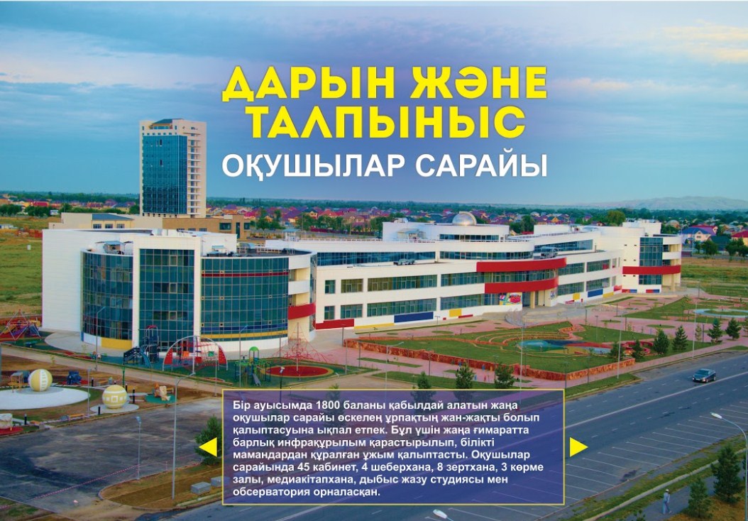 Бір ауысымда 1800 баланы қабылдай алатын жаңа оқушылар сарайы өскелең ұрпақтың жан-жақты болып қалыптасуына ықпал етпек. Бұл үшін жаңа ғимаратта барлық инфрақұрылым қарастырылып, білікті мамандардан құралған ұжым қалыптасты. Оқушылар сарайында 45 кабинет, 4 шеберхана, 8 зертхана, 3 көрме залы, медиакітапхана, дыбыс жазу студиясы мен обсерватория орналасқан.