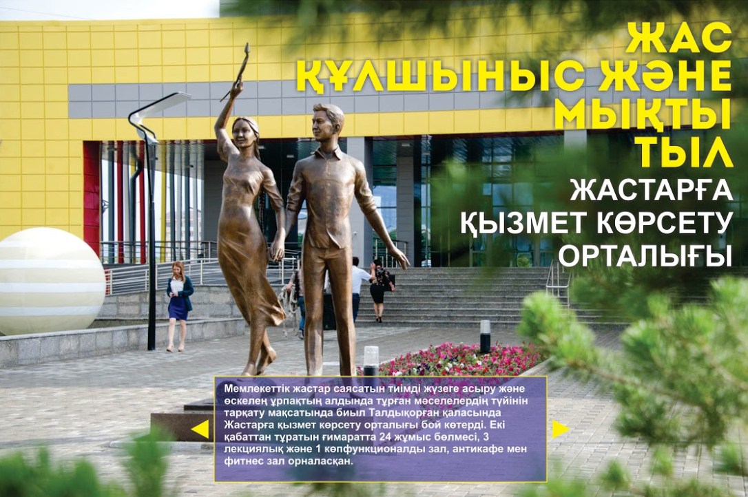 Мемлекеттік жастар саясатын тиімді жүзеге асыру және өскелең ұрпақтың алдында тұрған мәселелердің түйінін тарқату мақсатында биыл Талдықорған қаласында Жастарға қызмет көрсету орталығы бой көтерді. Екі қабаттан тұратын ғимаратта 24 жұмыс бөлмесі, 3 лекциялық және 1 көпфункционалды зал, антикафе мен фитнес зал орналасқан.