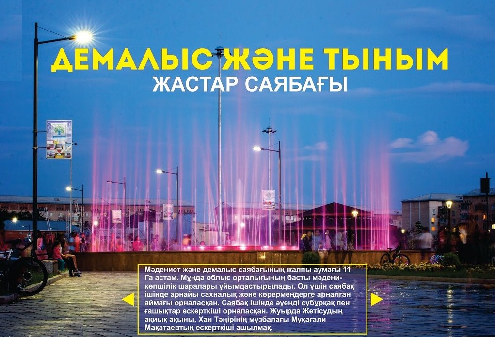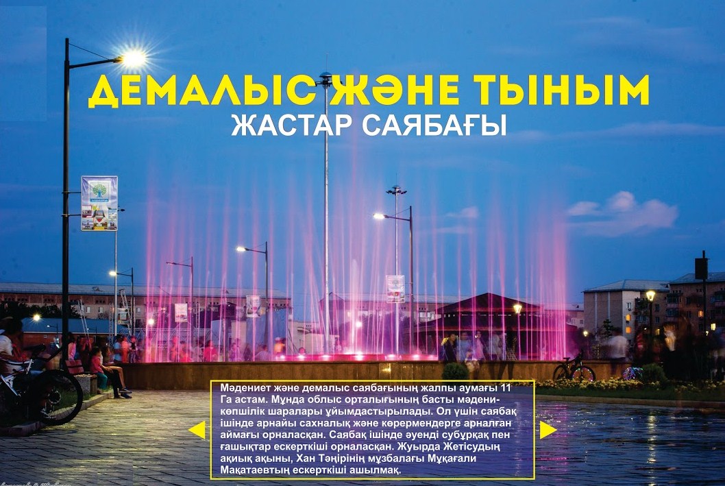 Мәдениет және демалыс саябағының жалпы аумағы 11 Га астам. Мұнда облыс орталығының басты мәдени-көпшілік шаралары ұйымдастырылады. Ол үшін саябақ ішінде арнайы сахналық және көрермендерге арналған аймағы орналасқан. Саябақ ішінде әуенді субұрқақ пен ғашықтар ескерткіші орналасқан. Жуырда Жетісудың ақиық ақыны, Хан Тәңірінің мұзбалағы Мұқағали Мақатаевтың ескерткіші ашылмақ.