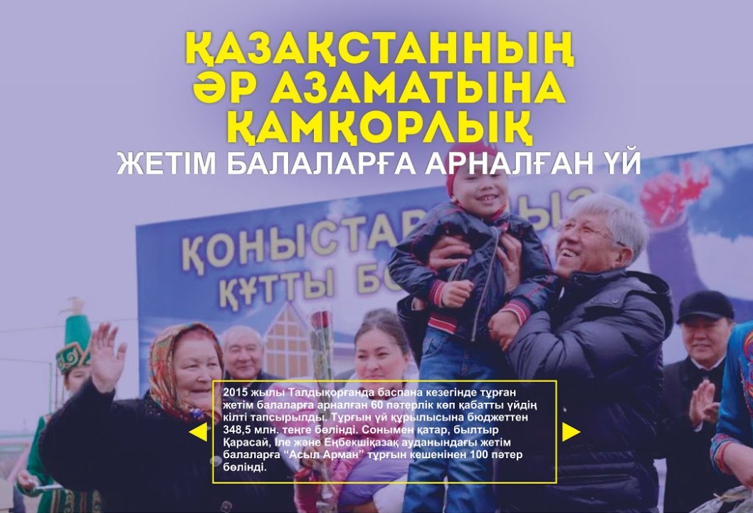 2015 жылы Талдықорғанда баспана кезегінде тұрған жетім балаларға арналған 60 пәтерлік көп қабатты үйдің кілті тапсырылды. Тұрғын үй құрылысына бюджеттен 348,5 млн. теңге бөлінді. Сонымен қатар, былтыр Қарасай, Іле және Еңбекшіқазақ ауданындағы жетім балаларға “Асыл Арман” тұрғын кешенінен 100 пәтер бөлінді.