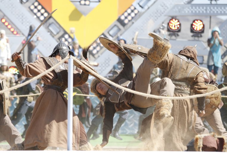 В исполнении танцевальных коллективов, актеров, конно-каскадерской группы и военнослужащих зрители познакомились с историей появления казахских стрелков.
