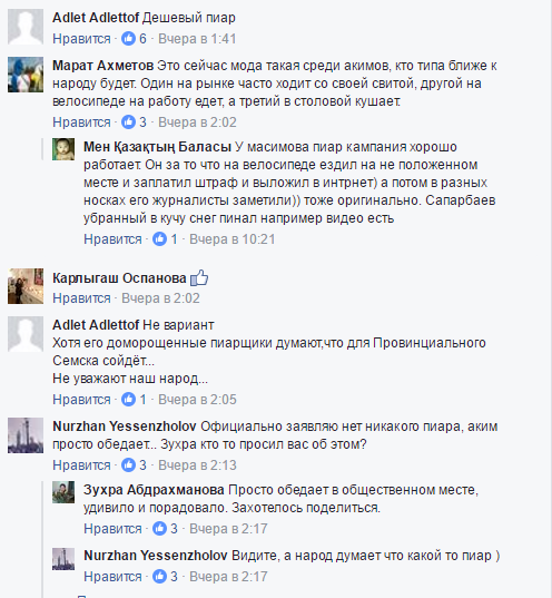 "Это сейчас мода такая среди акимов, кто типа ближе к народу будет. Один на рынке часто ходит со своей свитой, другой на велосипеде на работу едет, а третий в столовой ест", – высказался семейчанин Марат Ахметов.