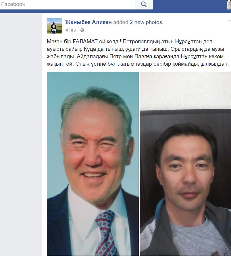 Осыған орай пікір білдіріп жатқан желі қолданушылардың бірі Жаныбек Аликен "Маған бір ҒАЛАМАТ ой келді! Петропавлдың атын Нұрсұлтан деп ауыстырайық. Құда да тыныш,құдағи да тыныш. Орыстардың да аузы жабылады. Айдаладағы Петр мен Павлға қарағанда Нұрсұлтан көкем жақын ғой. Оның үстіне бұл жағымпаздар бəрібір қоймайды,қылқылдап.", - деп жазды.