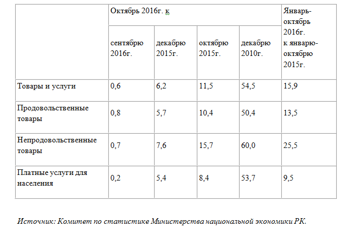 Динамика цен на потребительские товары и услуги в Республике Казахстан за 10 месяцев 2016 г.