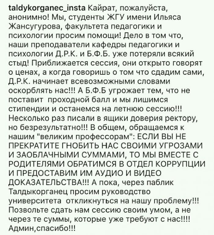 Instagram әлеуметтік желісінде пайда болған студенттер хатында ақша дәметкен ұстаздарынан шаршағанын, тіпті ректор атына дейін шағымданғандарын, бірақ одан ешқандай нәтиже жоқ екендігі жазылған.