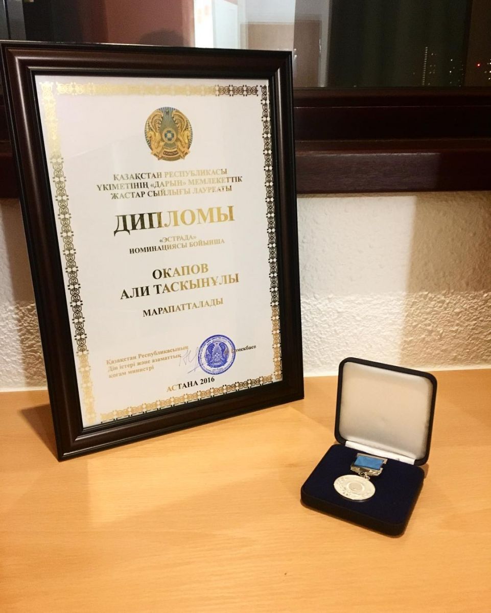 ""Дарын" мемлекеттік сыйлығының лауреаттары атандық!", - деп жазды Әли Оқапов өзінің Instagram парақшасында. Белгілі болғандай, Әли Оқаповпен бірге Қайрат Нұртас және Асылхан Төлепов «Дарын» мемлекеттік сыйлығын иеленді.