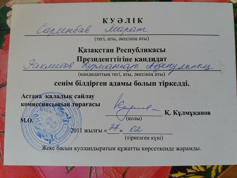 Осыдан дәл 4 жыл бұрын, 2011 жылғы Президенттік сайлауға (додаға) түскен 22 азаматтың қатарында - 3 партия тарапынан, 18 - жеке азаматтар және жалғыз қоғамдық бірлестіктер атынан - Желтоқсан туын көтеріп, кешкісін астаналық желтоқсандықтар - Тоқтар, Марат, бауырларым - Сәлім, Ерзаттарды ертіп ҚР ОСК ғимаратына бет алдым.