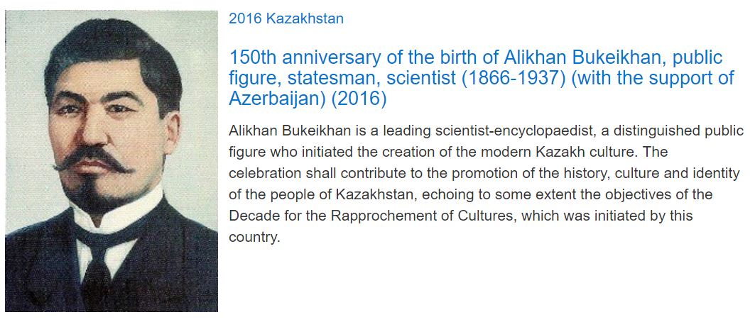 Үстіміздегі жылы Ә.Н. Бөкейханның туғанына 150 жыл толған мерейтойы, ЮНЕСКО Бас конференциясының 2015 жылғы 18 қарашадағы Қаулысына сәйкес халықаралық деңгейде тойлануға тиіс еді. Сонымен қатар, ЮНЕСКО Алты Алаш көсемін «бүкіл дүниежүзілік маңызы бар шынайы даңқты қайраткер» деп мойындады.