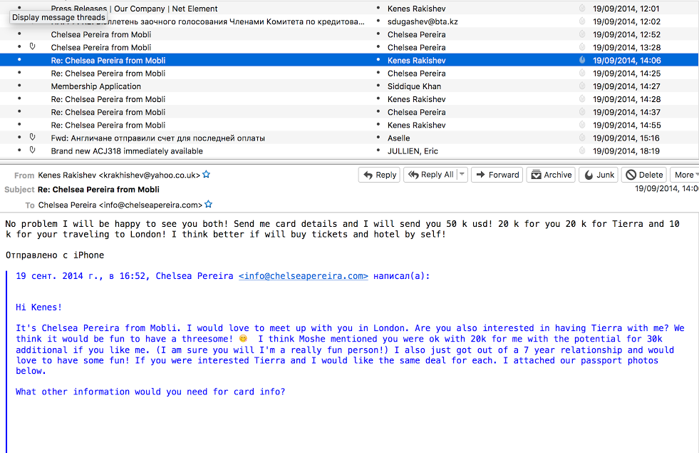 Компромат сайтында Отандық олигархтың Петр Листерманмен сөйлескен үзіндісі бар болатын. Базбіреулер хат алмасуды ғаламтор бетінен алып үлгерген. Аталмыш хат алмасу қазақстандық миллионер Рақышевтың Листерманның «жеңгетайлығына» жүгінетінін айғақтайды.