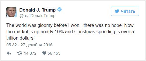 «Мен жеңіске жеткенге дейін әлем түнек болған – ешқандай үміт болмады. Ал енді нарық 10%-ға артты, Рождествоға кеткен шығын 1 трлн $ құрады», – деп жазды Трамп твиттер парақшасында.
