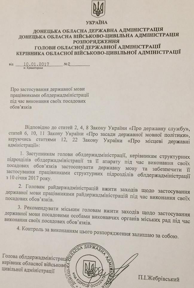Донецк облысының губернаторы Павел Жебрвиский облыстық әкімшілік қызметкерлеріне жұмыста тек украин тілін қолдануға бұйрық берді. Қаулыны Павел Жебрвиский өзінің facebook парақшасында жариялады.