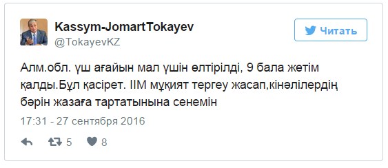 Тіпті, Сенат Төрағасы Қасым-Жомарт Тоқаев: ««Алматы облысында үш ағайын мал үшін өлтірілді, 9 бала жетім қалды. Бұл қасірет. ІІМ мұқият тергеу жасап, кінәлілердің бәрін жазаға тартатынына сенемін», - деген еді.