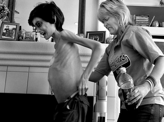 Әбден қажыған Дерек бірнеше қадам жасауға бар күшін салуда. Ісіктің салдарынан асқазаны соншалықты үлкейіп кеткен, тіпті, шалбарына сыйатын емес.
