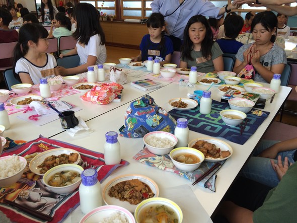Жапония мектептеріндегі түскі ас – тұнып тұрған дәстүр. Ең ұзақ үзіліс уақытында берілетін түскі ас бір сағатқа созылады. Кезекші оқушылар тамақты сыныптарға таратады.