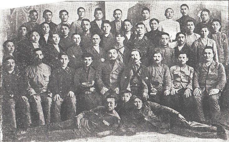 2. Ақмоладағы «Жас қазақ» ұйымын құрушылар. 1917 ж. Бірінші қатардағы оң жақтан төртінші – Сәкен Сейфуллин, жетінші – Қошке Кемеңгеров, екінші қатардағы оң жақтан бесінші – Дінше Әділов, оныншы – Бәкен Серікбаев, үшінші қатардағы оң жақтан төртінші – Сапар Мұстафин.