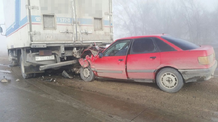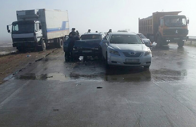 Ірі жол көлік апаты бүгін таңда Жамбыл облысы Жуалы ауданы Б.Момышұлы ауылының маңында болған. Жол тайғақ болмағанымен, таңғы тұман мен тежеуіш жолын ұзартқан нам жолдың салдарынан Mazda 626, Toyota Camry, ВАЗ-2114, Audi 80 и грузовик Mercedes-Benz көліктері соқтығысқан. «Тайота» және «лада» автокөліктерінің жүргізушілері ауыр жарақат алған, ал қалған жүргізушілер аман-сау.