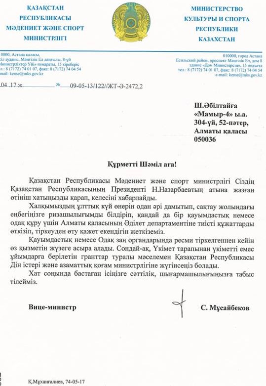 Белгілі болғандай, күйші-домбырашы, Қазақстанның еңбек сіңірген қайраткері Шәміл Әбілтай президент Назарбаевтың атына күй мұрасына жанашыр болуын сұрап хат жазған. Оған жауап берген Мәдениет және Спорт вицеминистрі Мұсайбеков күйшіге Алматы қаласының Әділет департаментіне тиісті құжатты өткізуін сұраған.
