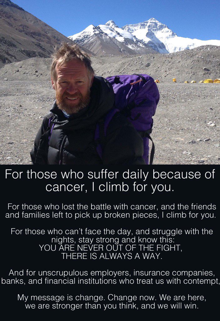 «Мен Эверестке қатерлі ісікпен күресіп жатқан адамдар үшін шықтым. Сол күрестен жеңіліс тауып, бүгінде дүниеден өткен адамдардың туыстары үшін шықтым», деп жазылған енді бір жазбасында.