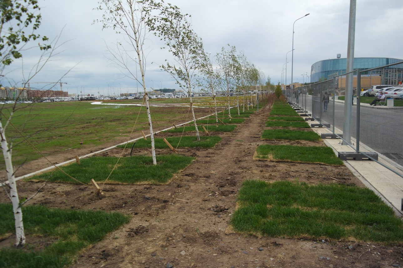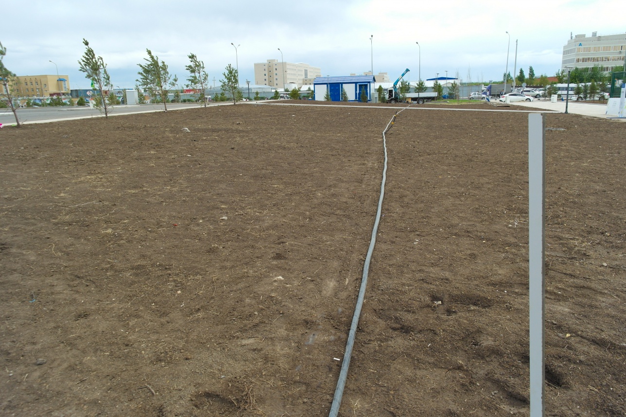 Аймақтың көгалдандыруына жауапты орталық әкелген арнайы шөптің түптерінің өзі қурап кеткен. Жапан далаға ұқсап қалып кеткен гүлзар ішіндегі құрғақ жер құрылыстан кейінгі қоқысты жасыруға шамасы жетпей тұр.