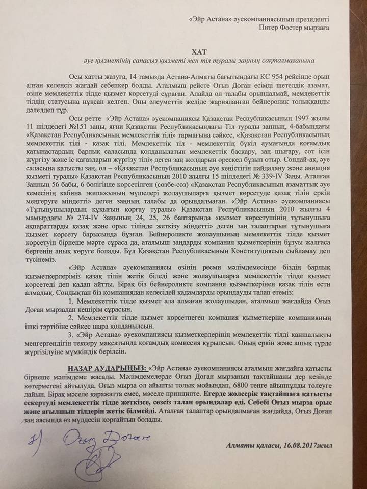 Осы хатты жазуға, 14 тамызда Аcтана-Алматы бағытындағы КС 954 рейсінде орын алған келеңсіз жағдай себепкер болды. Аталмыш рейсте Оғыз Доған есімді шетелдік азамат, өзіне мемлекеттік тілде қызмет көрсетуді сұраған. Алайда ол талабы орындалмай, мемлекеттік тілдің статусына нұқсан келген. Оны әлеуметтік желіде жарияланған бейнеролик толыққанды дәлелдеп тұр.