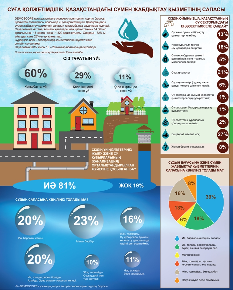 Жақында «DEMOSCOPE» қоғамдық пікірге экспресс-мониторинг жүргізу бюросы Қазақстандағы сумен жабдықтау қызметінің сапасы» тақырыбында сауалнама жүргізген болатын. Бұл туралы «Қамшы» порталы хабарлайды.