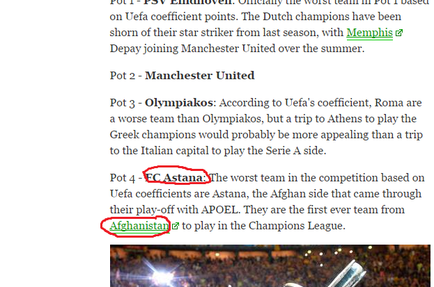Британдық «The Independent» басылымы қазақстандық “Астана” командасын ауғанстандық клуб деп жариялап, кейін осы қателігі үшін кешірім сұрады. Ал, танымал неміс футболшысы Лукаш Подольски Қазақстанды келекеге айналдырды. Бұл туралы "Қамшы" порталы NUR.KZ -ке сілтеме жасай отырып хабарлайды.