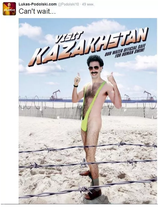 Футболдан Германия құрамасы мен “Галатасарай” клубының ойыншысы Лукаш Подольски “Борат еліне” келуге дайын екенін айтып, Қазақстанды келемеждеді. Монакода Чемпиондар лигасының жеребе тарту рәсімі аяқталған соң, Түркияның “Галатасарай” клубы “Бенфика”, “Атлетико” және “Астанамен” бір топқа түскені анықталды.