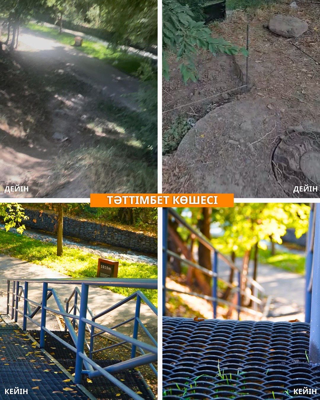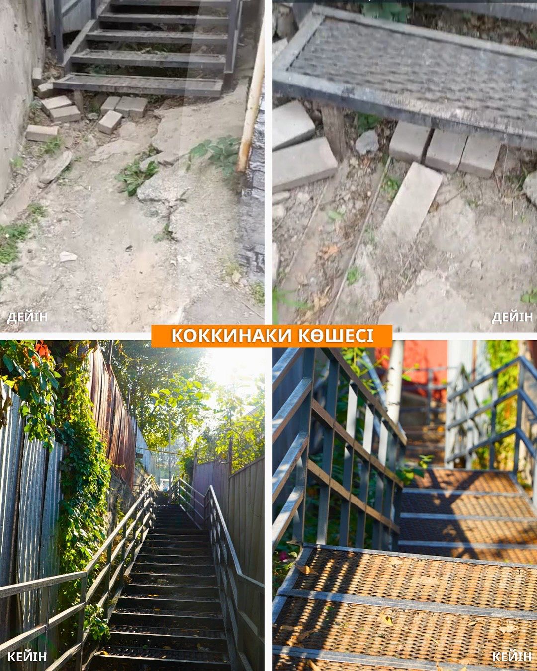 Жоба бойынша мына мекенжайларда баспалдақтар жаңартылды: Терренкур – 36 м, Тәттімбет көшесі – 34 м, Коккинаки көшесі – 36,6 м, Роза Бағланова көшесі – 39,5 м, Шухов көшесі – 104 м, әл-Фараби даңғылы мен Луганский көшесінің қиылысы – 30 м, Есентай өзенінің бойы мен Ахмедияров көшесінің бұрышы – 5 м.