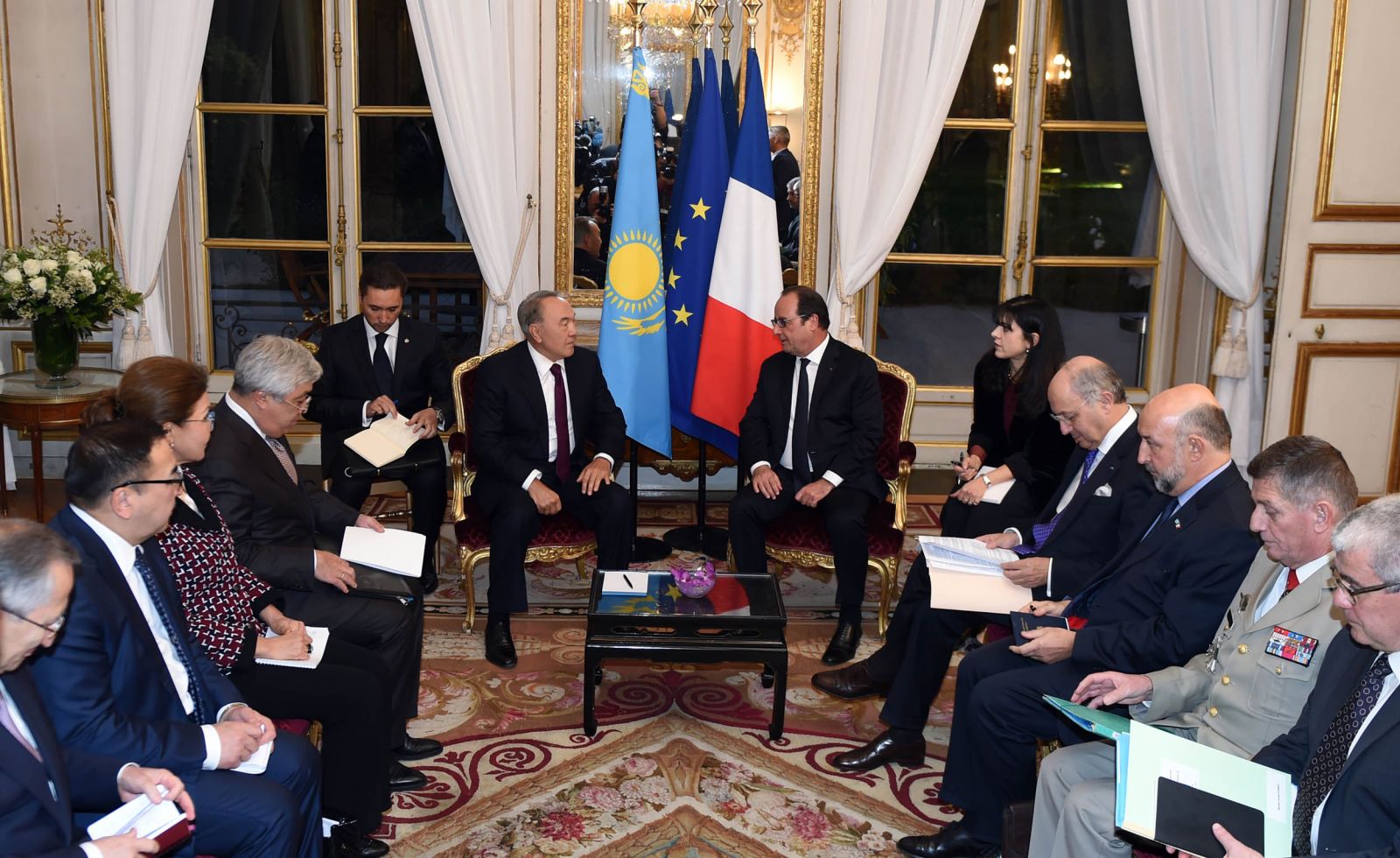 Елбасы Н. Назарбаев Францияның Қазақстан үшін маңызды серіктес екенін және екі ел арасында бүгінгі таңда экономика мен саясаттың түрлі саласында терең түсіністік қалыптасқанын баса айтты. Өз кезегінде Франсуа Олланд та қазақ еліне деген ақ жүрегін ақтарды. Бүгінгі дағдарыс қиындықтары елдің әлеуетін арттыруға көмектессін деген тілектерін айта келе, Қазақстанның әріптестікті дамыту ұсынысы Францияның ниетімен үндес екенін жеткізді.