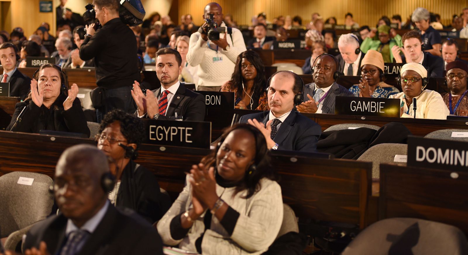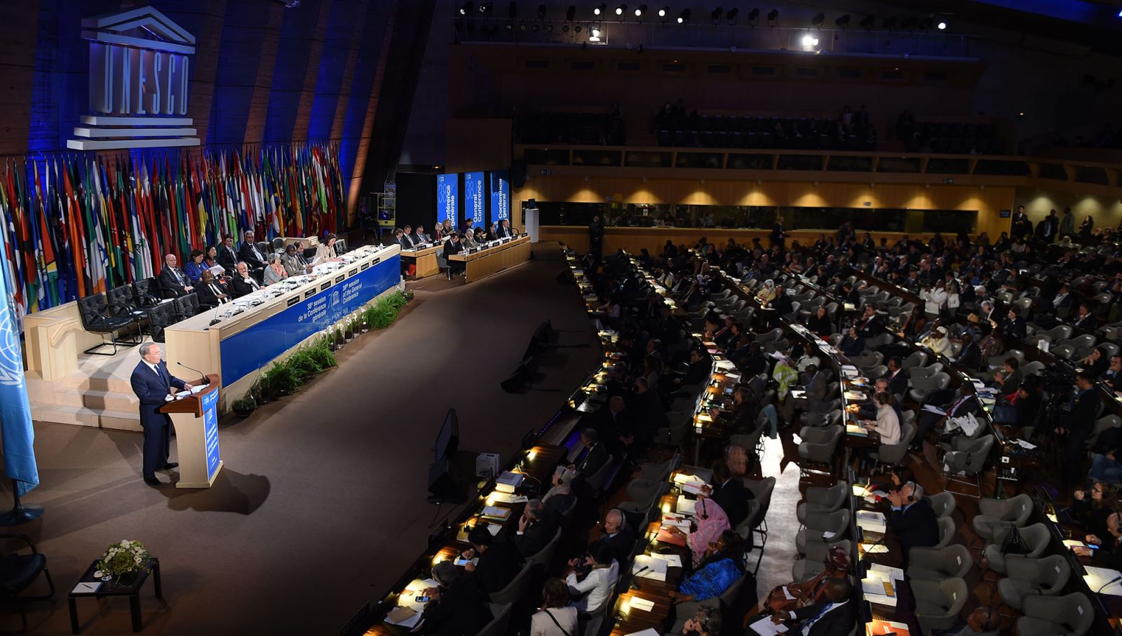 ЮНЕСКО Бас конференциясы 38-сессиясының жұмыс жоспары бойынша Қазақстан Президенті Нұрсұлтан Назарбаев баяндама жасау керек болатын. Жиын қатысушыларына баяндама жасау үшін мінберге көтерілген Нұрсұлтан Әбішұлы сессия қатысушыларына қазақ тілінде тіл қатты.