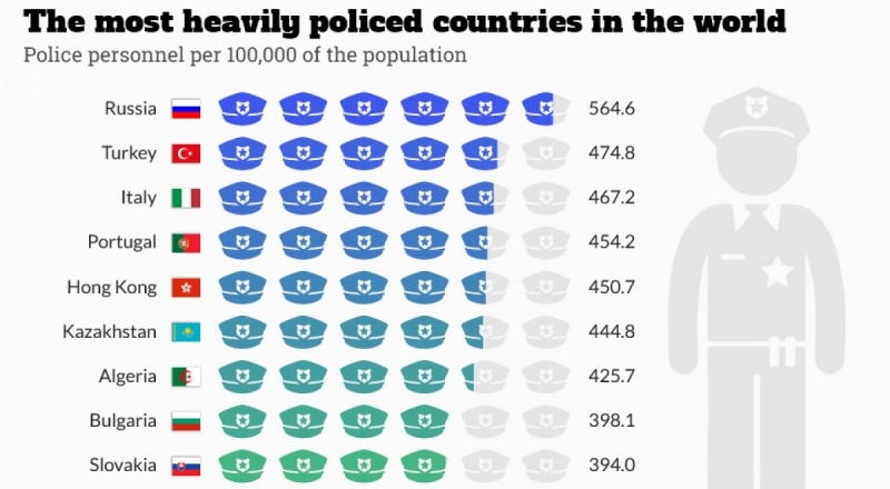 Осы ретте халықаралық нормаларға сай, халық санына шаққандағы полицейлердің үлесі туралы да айта кеткен жөн. 100 мың адамға 445 полиция қызметкерінен келетін Қазақстан бұл көрсеткіш бойынша былтыр 6 орынды иеленгені және бар. Әлемдік тәжірибеде бұл бағыттағы орташа көрсеткіш 100 мың адамға 300 полицей шамасында көрінеді.