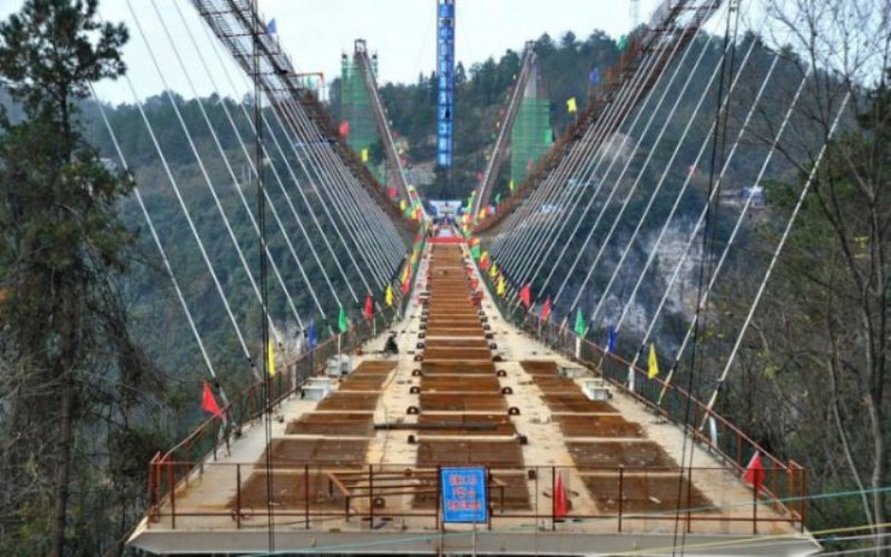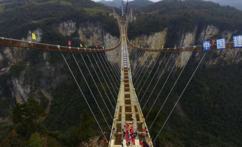 Қытайдың Тяньмэньшань ұлттық саябағында салынып жатқан әлемдегі ең ұзын шыныдан жасалған көпір құрылысы бітуге таяп қалды.
