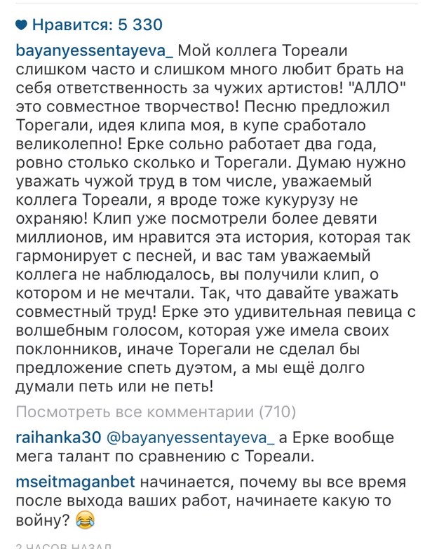 "Meniń áriptesim Tóreáli ózge ártister úshin jaýapkershilikti tym jıi ózine alǵandy jaqsy kóredi. "Alo" - bul ortaq týyndy. Ándi Tóreǵalı usyndy, al klıp túsirý ıdeıasy meniki, birge oıymyz keremet júzege asty. Erkeniń Tóreǵalı sekildi sahnada jeke án aıtyp júrgenine eki jyl boldy. Ózgeniń eńbegin syılaı bilý kerek dep oılaımyn, qurmetti áriptesim Tóreáli, men de júgeri kúzetip otyrǵan adam emespin. Klıpti 9 mln-nan astam adam qarady, olarǵa ánmen úılesken bul oqıǵa unaıdy, al sizdi klıp túsirgende kórgen eshkim joq. Siz armandap kórmegen klıpke qol jetkizdińiz. Sol sebepti, ortaq eńbekti qurmetteıik. Erke daýysy keremet ánshi, óziniń tabynýshylaryn da jınap úlgergen. Olaı bolmaǵan jaǵdaıda Tóreǵalı oǵan dýet bolyp shyǵý usynysyn jasamas edi. Biz kelisý-kelispeý jaǵyn uzaq oılanǵan edik", - dep jazǵan Baıan.