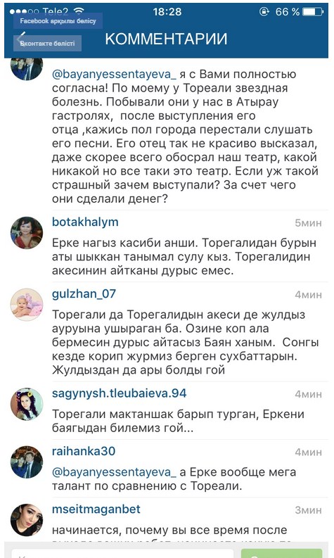 Baıannyń bul jazbasyna pikir qaldyrǵandardyń deni onyń sózine qosylatynyn jazǵan. Jeli qoldanýshylary "Tóreǵalı Tóreáliniń juldyz aýrýyna shaldyqqanyn" aıtyp, Erkeniń olarmen salystyrǵanda naǵyz daryn ıesi ekenin sóz etken.