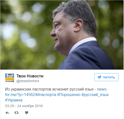 2014 jyly Ýkraına bıligi aýysqannan soń, elden orys tilin tolyǵymen joıý maqsaty kózdelgen. Ýkraına prezıdenti Petr Proshenko orys tilin memlekettik til mártebesi, sonymen qatar, qoǵamdaǵy bedelinen aıyrý maqsatynda bar kúshin jumyldyrýda. Sońǵy eki jylda orys tilinde jazylǵan mańdaıshalar, jarnamalar, vokzal, metro, aeroporttaǵy habarlandyrýlar – barlyǵy alynyp, ýkraın tiline aýysqan, mektep oqýlyqtary jańadan jazylyp, kınolardyń barlyǵy memlekettik tilde dybystalatyn bolǵan.