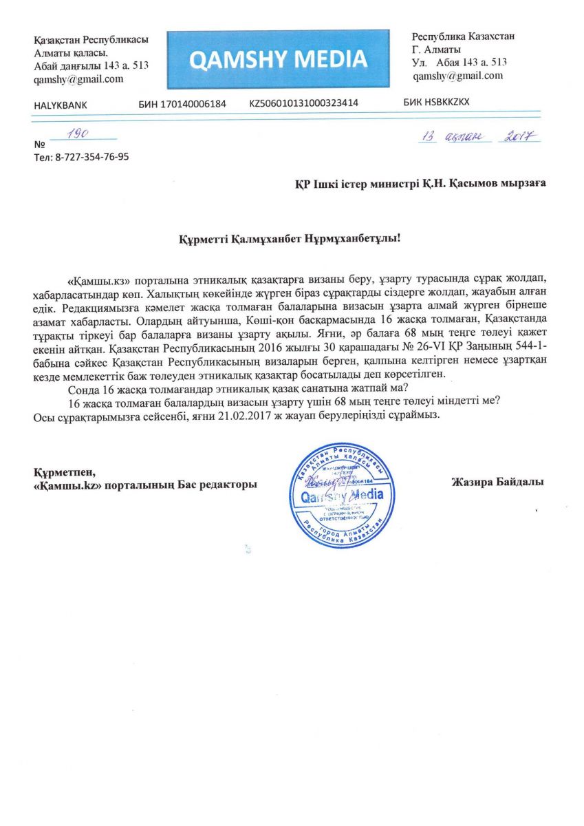 «Qamshy.kz» portaly buǵan deıin etnıkalyq qazaqtarǵa vızany berý, qalpyna keltirý jáne uzartý týrasynda birneshe materıal jarıalady. Onda Qazaqstan Respýblıkasynyń zańyna sáıkes etnıkalyq qazaqtardyń vızaǵa qatysty barlyq memlekettik baj salyǵynan bosatylatyny jazylǵan. Osydan keıin redaksıamyzǵa kámelet jasqa tolmaǵan, Qazaqstanda turaqty tirkeýi bar eki balasynyń vızasyn uzarta almaı júrgen azamat habarlasty. Qazir Astana qalasynda turady. Oǵan kóshi-qon basqarmasynda 16 jasqa tolmaǵan balalardyń vızany uzartýǵa qajetti 68 myń teńgeni tóleý kerektigin aıtqan. Eki balasyna 140 myńǵa jýyq aqshany tóleı almaıtynyn aıtady qandasymyz.