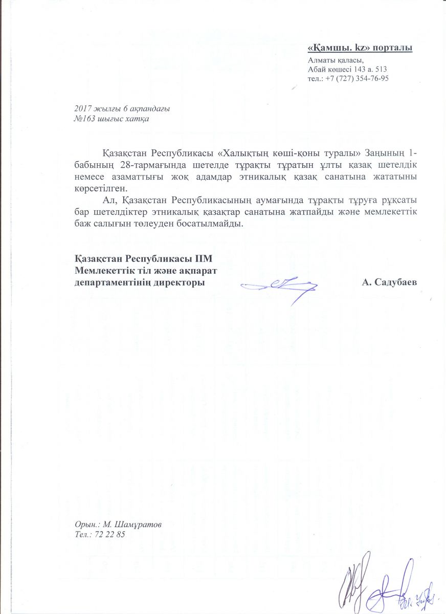 Máseleniń mán-jaıyn anyqtaý úshin QR İİM hat joldap, resmı jaýap aldyq. Oǵan sáıkes Qazaqstan Respýblıkasynyń «Halyqtyń kóshi-qon» týraly Zańda 1-babtyń 28-shi tarmaǵynda shetelde turaqty turatyn ulty qazaq sheteldik nemese azamattyǵy joq adamdar etnıkalyq qazaq sanatyna jatatyny kórsetilgeni jáne Qazaqstan aýmaǵynda turaqty turýǵa ruqsaty bar sheteldik etnıkalyq qazaqtar sanatyna jatpaıdy, tıisinshe memlekettik baj salyǵyn tóleýden bosatylmaıdy degen jaýap keldi.