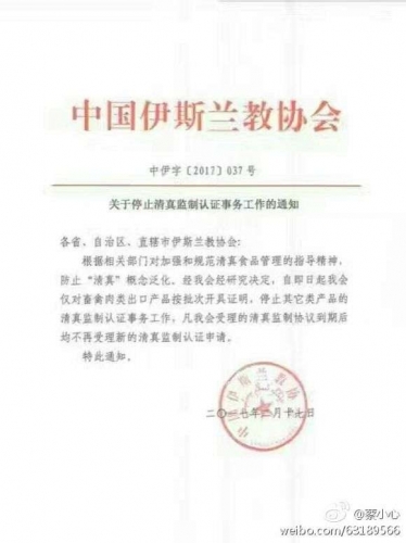«Tıesili organdardyń halal azyqtardy basqarýdy kúsheıtýine saı, «Halal(清真.Musylmansha)» uǵymynyń jalpylanyp ketýiniń aldyn alý maqsatynda Qytaı Islam qoǵamynyń zerttep bekitýimen eksportqa shyǵatyn qus pen mal etinen basqa taýar túrlerine kýálandyrý berilmeıdi. Buǵan deıin jasalǵan barlyq kýálandyrý kelisimderi merzimi aıaqtaǵannan keıin kelisim jasalmaıtyn bolady», delingen arnaıy málimdemede. Onda bıylǵy jyldyń 17 aqpany kórsetilgen.