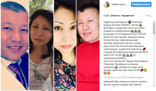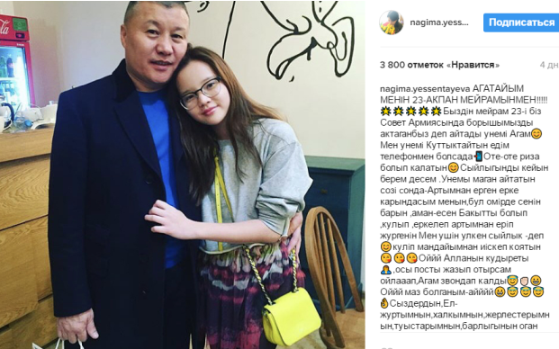 «Aǵataıym sendeı aq kóńil, keń peıil azamatty jaratqanyna birinshi Allaǵa rahmet aıtamyn. Ekinshiden, ata-anamyzga myń alǵys. Asqar taýdaı, janyma jalaý bolar, aǵalyk qamqorlyǵyńmen aıalaǵan, júregimnin árbir soqqan dúrsiliniń biri bolǵan maqtanyshym, qamqorshym, júregimniń jartysy. Ortamyzga aman-esen tezirek oralsań eken jan aǵam».