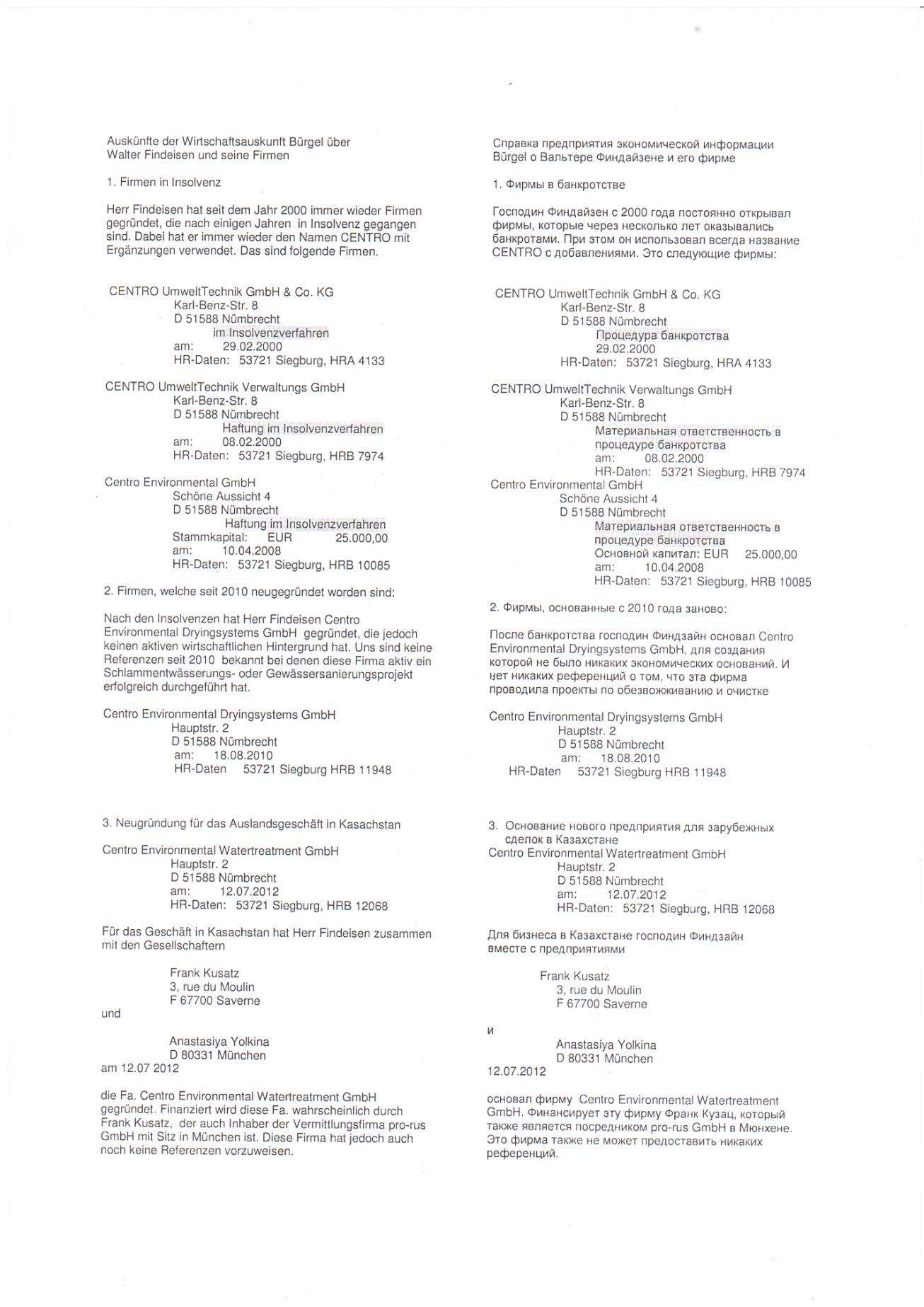 - Fındzaın (Walter Findeisen) fermasynyń aty talaı ret ózgerýine qaramastan bankrotqa ushyraı beretini týraly quzretti organnyń málimetteri