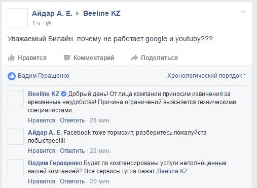 Қазақстанда түскі сағат он екілер шамасында Youtube, Gmail, Google жүйелері ашылмай қалды. Ғаламтор пайдаланушылар орын алған ақауларға қатысты өздерінің байланыс операторларына шағымданған. Әзірге «Билайн» операторы осы жағдайға қатысты жауап қатып, өздерінің сайттарды бұғаттауға құқықтары жоқ екендігін айтқан. Жекелеген желі қолданушылары Фейсбук желісінің де жұмысына шағымданған.