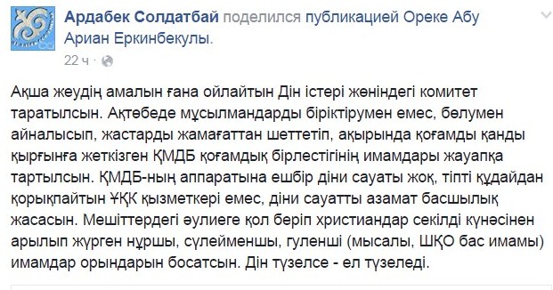 «Ақша жеудің амалын ғана ойлайтын Дін істері жөніндегі комитет таратылсын. Ақтөбеде мұсылмандарды біріктірумен емес, бөлумен айналысып, жастарды жамағаттан шеттетіп, ақырында қоғамды қанды қырғынға жеткізген ҚМДБ қоғамдық бірлестігінің имамдары жауапқа тартылсын. ҚМДБ-ның аппаратына ешбір діни сауаты жоқ, тіпті құдайдан қорықпайтын ҰҚК қызметкері емес, діни сауатты азамат басшылық жасасын. Мешіттердегі әулиеге қол беріп христиандар секілді күнәсінен арылып жүрген нұршы, сүлейменшы, гуленші (мысалы, ШҚО бас имамы) имамдар орындарын босатсын. Дін түзелсе - ел түзеледі» деп жазады А. Солдатбай.